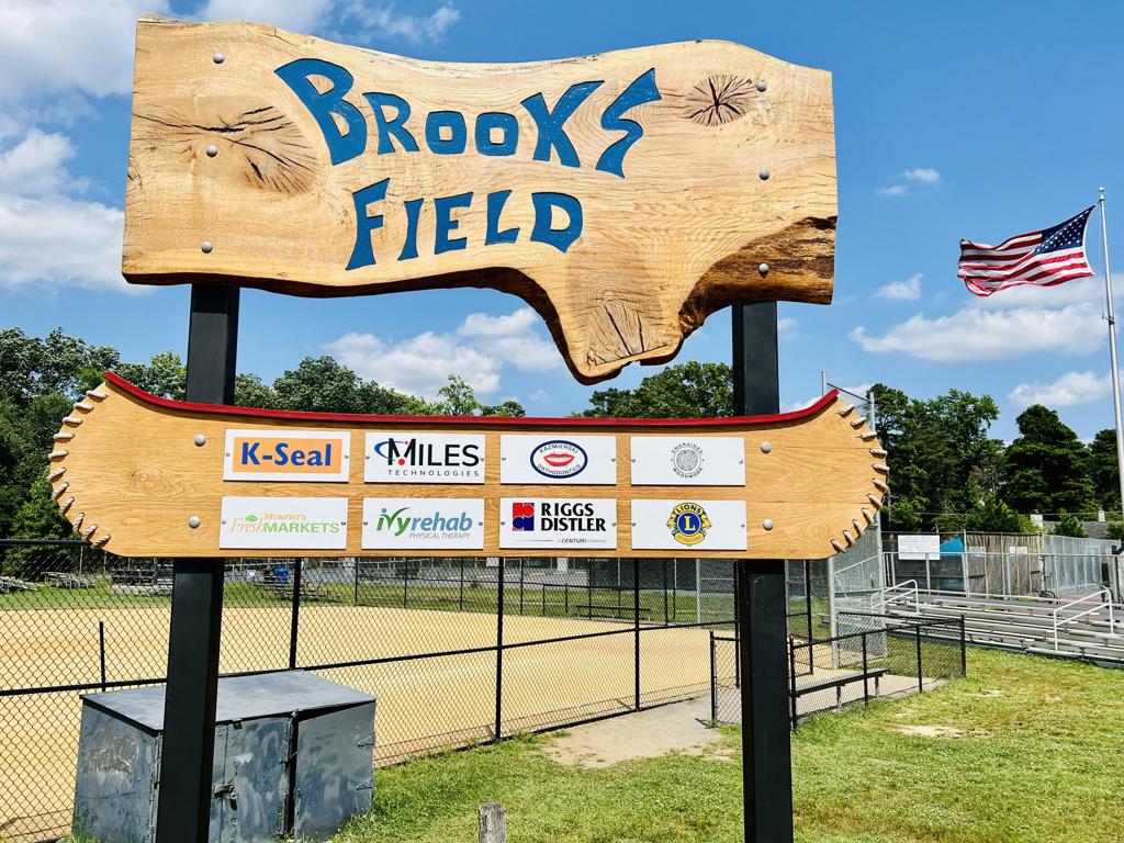 MLAA would like to thank Kevin Koch Project Manager and Jason Jenkins from Engrained Woodwork for designing this piece of art. Special thanks to Jon Shelley with Full Circle Woodworx for providing the wood slab along with Matt Bailey for providing assistance in the construction. Vic Singh provided the original CAD drawing. Joe Adamson Architects created the engineered drawings and George Wiker also provided his expertise as an engineer. Lee Miller with Riggs Distler provided the machinery to dig and lift the sign into its new home giving Brooks Field a new identity.